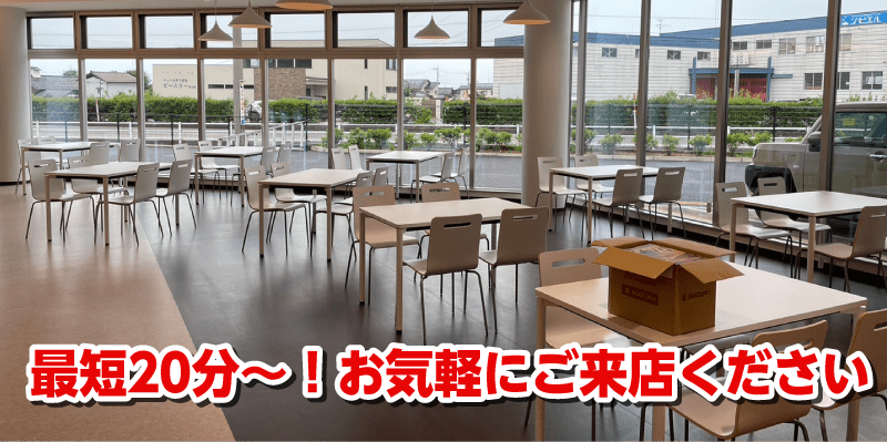 ご予約いただければあまりお待たせせずに作業にとりかかりますので、およそ20分程の待ち時間となります。お客様の混雑状況によっては多少前後することがございます。追加作業がある場合は多少時間が前後します。
